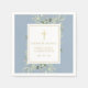 Esta elegante servilleta azul polvorienta de unión sagrada con hojas de agua de eucalipto de bosque y un elegante crucifijo de oro se puede personalizar con su información especial de celebración en la moderna tipografía de oro. Diseñado por Thisisnotme©