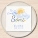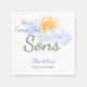 This cute twin boys' baby shower napkin is decorated with a yellow watercolor sun, clouds, and stylish blue typography. Easily customizable. Original Watercolor © Michele Davies.