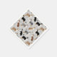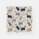 Pastores australianos cortos / Perros australianos con abrigos negros, marrones y merluzas sentados y parados con huesos de perro dispersos y huellas de pata en un fondo gris claro.