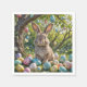 Un bonito conejo se sienta rodeado de huevos coloridos y decorados bajo un árbol con huevos colgados