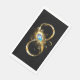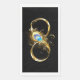 Oro, símbolo brillante de infinito, decorado con una pluma de pavo real de joyas con un fondo turquesa en negro.