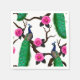 Pájaros pavos reales encarnándose en ramas y flores camélicas rosas, este patrón se dibuja a mano en Photoshop.