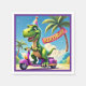 Un vibrante dinosaurio personalizado, con un gorra fiesta, recorre un camino soleado en una moto morada. La escena se sitúa sobre un telón de fondo de palmeras y nubes onduladas, con una pancarta de cumpleaños flameando por la brisa. Esta divertida imagen captura el espíritu de celebración y aventura, perfecto para una fiesta de cumpleaños.