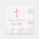 Sencilla y moderna celebración personalizada del bautismo servilleta en colores rosados y grises para la niña. Incluye "Dios Bendito" con el nombre del bebé personalizado texto y una cruz.