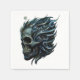 La llama de la vida: un diseño de cráneo. Calavera metálica que impresiona por su apariencia detallada. Los intrincados patrones tipo llama que se extienden dinámicamente desde la parte superior del cráneo crean un movimiento vivo y atraen la atención del espectador. El fondo es un verde azulado suave y silencioso que contrasta armoniosamente con el cráneo
