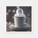 Una taza humeante de chocolate caliente coronada con malvaviscos, coronada con un muñeco de nieve en miniatura. La iluminación cálida y los malvaviscos dispersos crean un ambiente acogedor y festivo.