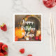 Piscinas de papel con una fotografía de una cosecha de acción de gracias, colocadas sobre una mesa rústica de madera. Calabaza, papas, calabazas, etc... componen esta abundante colección de comida. Unas coloridas hojas de otoño rodean la cesta de cornucopia.