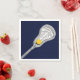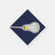 Fiesta de lacrosse creativo o chicas equipo de toallas deportivas con palo lax y bola en el campo azul marino.