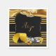 Una lujosa y brillante textura de seda dorada, adornada con dos anillos bodas sobre un fondo negro dramático con una franja de estilo deco para dar al diseño una moda y un aspecto glamoroso que personalizar.con las iniciales de la pareja boda.