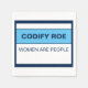 Codificar las mujeres de carretera son personas. Codificar Roe debería ser el piso de los derechos de salud de las mujeres, no el techo. Y ahora ni siquiera eso existe. Díganle al Congreso que es hora de que hagan lo menos que puedan por la salud, la seguridad y la igualdad de las mujeres, porque las mujeres son personas y el aborto, sea cual fuere la razón, es la atención médica. Descripción del diseño: el espacio de diseño es un fondo blanco con un borde azul oscuro. En la mitad superior del espacio de diseño, las palabras "Codificar la ruta" en una fuente sans serif azul oscuro. Debajo, una amplia franja azul claro con bordes superiores e inferiores azul oscuro. Debajo de la franja, en la mitad inferior del diseño, las palabras "Las mujeres son personas".