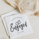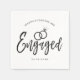 Una servilleta con letras de guión divertida y única adaptada específicamente para ti para una fiesta de compromiso. Cuenta con la palabra comprometidos con anillos de boda descansando alrededor. Debajo de esto y encima están los nombres de la novia y el novio y la fecha de compromiso.