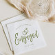 Una servilleta con letras de guión divertida y única adaptada específicamente a una fiesta de compromiso. Cuenta con la palabra comprometidos con anillos de boda descansando alrededor. Debajo y encima de esto están los nombres de la novia y el novio y la fecha de compromiso.