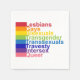 Este diseño presenta un arcoíris y las palabras Lesbianas, Gays, Bisexuales, Transgénero, Transexuales, Travesty, Intersex y Queer.