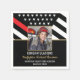 Este diseño cuenta con una bandera de bomberos con rayas blancas y negras y una delgada franja roja. Los detalles para el bombero graduado se sientan debajo de una foto del nuevo graduado de la academia de bomberos.