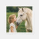 A young Caucasian girl with curly hair and wearing a white lace dress gently kisses the nose of a light-colored horse in a lush green meadow, expressing a peaceful bond between them