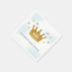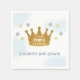 A little prince is on the way! Boy baby shower with gold crown and silver and gold stars with dreamy blue watercolor background