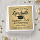 Añada un toque elegante y personalizado a las decoraciones de la fiesta de graduación de la universidad o la escuela secundaria con estas servilletas de papel negro y oro personalizado. Todo el texto es sencillo para el personalizar. El diseño presenta un fondo dorado de acero inoxidable en forma de imitación, un tapón negro de la placa de mortero, una tipografía moderna y elegante y caligrafía de escritura a mano. Tenga en cuenta que el oro es color impreso, no Relieve metalizado metálico. ¡Felicitaciones al graduado!
