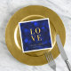 Servilleta elegante con la palabra "Amor" en falso foil dorado sobre un fondo de luces bokeh azul zafiro. Perfecta para fiestas de compromiso, bodas y aniversarios.