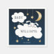 Dulce servilleta fiesta para su ducha de bebé con tema de canciones de cuna. Ilustracion de nubes con un conejito asomando la cabeza de uno de ellos. Puede agregar el apellido del bebé y la fecha del evento. Hay una luna sucia dorada y estrellas en un fondo azul marino. Ilustracion y diseño originales de Namibear Art Studio.