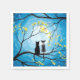 Dos gatos sentados en una rama mirando la luna llena con un cielo azul lleno de estrellas. Las ramas de los árboles que los rodean con flores amarillas pequeñas. Gato de esmoquin negro y gato manchado de dos colores blanco y gris. Pintura acrílica original moderna y caprichosa de Donna Leger. Todos Los Derechos Reservados. ©diseños de ironía
