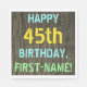 Este divertido diseño de servilletas para fiesta de cumpleaños presenta un mensaje como "FELIZ CUMPLEAÑOS 45, NOMBRE!", donde el nombre se puede personalizar. El fondo presenta un patrón de apariencia de grano de madera falsa marrón rústico. El texto del mensaje personalizado presenta colores como azul, amarillo y verde, y tiene una apariencia inspirada en la de letras pintadas con plantilla. Servilletas como estas podrían quizás ser utilizadas en una fiesta de cumpleaños para alguien que está celebrando su cumpleaños número cuarenta y cinco.