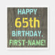 Este divertido diseño de servilletas de cumpleaños incluye un mensaje como "¡FELIZ CUMPLEAÑOS 65, NOMBRE PRIMERO!", donde el nombre puede ser personalizado. El fondo está decorado con un estilo rústico, marrón y falso de aspecto de grano de madera. El texto del mensaje personalizado presenta colores como azul, amarillo y verde, y tiene un aspecto inspirado en el de las letras pintadas y estampadas. Las servilletas como estas podrían ser usadas en una fiesta de cumpleaños para alguien que esté celebrando su sexagésimo quinto cumpleaños. [~Z0000292]