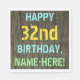 Este divertido diseño de servilletas de cumpleaños incluye un mensaje como "FELIZ 32 cumpleaños, NOMBRE - AQUÍ!", donde el nombre puede ser personalizado. El fondo está decorado con un estilo rústico, marrón y falso de aspecto de grano de madera. El texto del mensaje personalizado presenta colores como azul, amarillo y verde, y tiene un aspecto inspirado en el de las letras pintadas y estampadas. Las servilletas como estas podrían ser usadas en una fiesta de cumpleaños para alguien que esté celebrando su 32 cumpleaños. [~Z0000292]