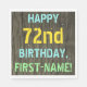 Este divertido diseño de servilletas de cumpleaños incluye un mensaje como "¡FELIZ CUMPLEAÑOS 72, NOMBRE PRIMERO!", donde el nombre puede ser personalizado. El fondo está decorado con un estilo rústico, marrón y falso de aspecto de grano de madera. El texto del mensaje de personalizable presenta colores como azul, amarillo y verde, y tiene un aspecto inspirado en el de las letras pintadas y estampadas. Las servilletas como estas podrían ser usadas en una fiesta de cumpleaños para alguien que está celebrando su cumpleaños número setenta. [~Z0000292]