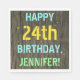 Este divertido diseño de servilletas de cumpleaños incluye un mensaje como "FELIZ CUMPLEAÑOS 24, JENNIFER!", donde el nombre se puede personalizar. El fondo está decorado con un estilo rústico, marrón y falso de aspecto de grano de madera. El texto del mensaje de personalizable presenta colores como azul, amarillo y verde, y tiene un aspecto inspirado en el de las letras pintadas y estampadas. Las servilletas como estas podrían ser usadas en una fiesta de cumpleaños para alguien que está celebrando su vigésimo cuarto cumpleaños. [~Z0000292]