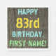 Este divertido diseño de servilletas para fiestas de cumpleaños incluye un mensaje como "¡FELIZ 83º CUMPLEAÑOS, NOMBRE PRIMERO!", donde el nombre se puede personalizar. El fondo está decorado con un estilo rústico, marrón y falso de aspecto de grano de madera. El texto del mensaje de personalizable presenta colores como azul, amarillo y verde, y tiene un aspecto inspirado en el de las letras pintadas y estampadas. Las servilletas como estas podrían ser usadas en una fiesta de cumpleaños para alguien que está celebrando su cumpleaños número ochenta. [~Z0000292]