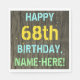 Este divertido diseño de servilletas de cumpleaños incluye un mensaje como "FELIZ CUMPLEAÑOS 68, NOMBRE - AQUÍ!", donde el nombre puede ser personalizado. El fondo está decorado con un estilo rústico, marrón y falso de aspecto de grano de madera. El texto del mensaje personalizado presenta colores como azul, amarillo y verde, y tiene un aspecto inspirado en el de las letras pintadas y estampadas. Las servilletas como estas podrían ser usadas en una fiesta de cumpleaños para alguien que esté celebrando su sexagésimo octavo cumpleaños. [~Z0000292]