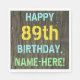 Este divertido diseño de servilletas de cumpleaños incluye un mensaje como "FELIZ 89º CUMPLEAÑOS, NOMBRE-AQUÍ!", donde el nombre se puede personalizar. El fondo está decorado con un estilo rústico, marrón y falso de aspecto de grano de madera. El texto del mensaje de personalizable presenta colores como azul, amarillo y verde, y tiene un aspecto inspirado en el de las letras pintadas y estampadas. Las servilletas como estas podrían ser usadas en una fiesta de cumpleaños para alguien que está celebrando su cumpleaños número ochenta y nueve. [~Z0000292]