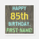 Este divertido diseño de servilletas de cumpleaños incluye un mensaje como "¡FELIZ 85º CUMPLEAÑOS, NOMBRE PRIMERO!", donde el nombre puede ser personalizado. El fondo está decorado con un estilo rústico, marrón y falso de aspecto de grano de madera. El texto del mensaje personalizado presenta colores como azul, amarillo y verde, y tiene un aspecto inspirado en el de las letras pintadas y estampadas. Las servilletas como estas podrían ser usadas en una fiesta de cumpleaños para alguien que está celebrando su cumpleaños número ochenta y cinco. [~Z0000292]