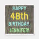 Este divertido diseño de servilletas de cumpleaños incluye un mensaje como "FELIZ CUMPLEAÑOS 48, JENNIFER!", donde el nombre se puede personalizar. El fondo está decorado con un estilo rústico, marrón y falso de aspecto de grano de madera. El texto del mensaje personalizado presenta colores como azul, amarillo y verde, y tiene un aspecto inspirado en el de las letras pintadas y estampadas. Las servilletas como estas podrían ser usadas en una fiesta de cumpleaños para alguien que está celebrando su cumpleaños cuarenta y ocho. [~Z0000292]
