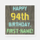 Este divertido diseño de servilletas de cumpleaños incluye un mensaje como "¡FELIZ 94º CUMPLEAÑOS, NOMBRE PRIMERO!", donde el nombre puede ser personalizado. El fondo está decorado con un estilo rústico, marrón y falso de aspecto de grano de madera. El texto del mensaje personalizado presenta colores como azul, amarillo y verde, y tiene un aspecto inspirado en el de las letras pintadas y estampadas. Las servilletas como estas podrían ser usadas en una fiesta de cumpleaños para alguien que está celebrando su cuarto cumpleaños. [~Z0000292]