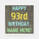 Este divertido diseño de servilletas de cumpleaños incluye un mensaje como "FELIZ 93 cumpleaños, NOMBRE AQUÍ!", donde el nombre puede ser personalizado. El fondo está decorado con un estilo rústico, marrón y falso de aspecto de grano de madera. El texto del mensaje personalizado presenta colores como azul, amarillo y verde, y tiene un aspecto inspirado en el de las letras pintadas y estampadas. Las servilletas como estas podrían ser usadas en una fiesta de cumpleaños para alguien que está celebrando su cumpleaños noventa. [~Z0000292]