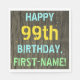 Este divertido diseño de servilletas de cumpleaños incluye un mensaje como "¡FELIZ 99º CUMPLEAÑOS, NOMBRE PRIMERO!", donde el nombre puede ser personalizado. El fondo está decorado con un estilo rústico, marrón y falso de aspecto de grano de madera. El texto del mensaje personalizado presenta colores como azul, amarillo y verde, y tiene un aspecto inspirado en el de las letras pintadas y estampadas. Las servilletas como estas podrían ser usadas en una fiesta de cumpleaños para alguien que está celebrando su cumpleaños noventa y nueve. [~Z0000292]