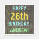Este divertido diseño de servilletas de cumpleaños incluye un mensaje como "¡FELIZ CUMPLEAÑOS 26, ANDREW!", donde el nombre puede ser personalizado. El fondo está decorado con un estilo rústico, marrón y falso de aspecto de grano de madera. El texto del mensaje de personalizable presenta colores como azul, amarillo y verde, y tiene un aspecto inspirado en el de las letras pintadas y estampadas. Las servilletas como estas podrían ser usadas en una fiesta de cumpleaños para alguien que está celebrando su 26º cumpleaños. [~Z0000292]