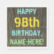 Este divertido diseño de servilletas de cumpleaños incluye un mensaje como "FELIZ 98º CUMPLEAÑOS, NOMBRE - AQUÍ!", donde el nombre puede ser personalizado. El fondo está decorado con un estilo rústico, marrón y falso de aspecto de grano de madera. El texto del mensaje de personalizable presenta colores como azul, amarillo y verde, y tiene un aspecto inspirado en el de las letras pintadas y estampadas. Las servilletas como estas podrían ser usadas en una fiesta de cumpleaños para alguien que está celebrando su cumpleaños noventa y ocho. [~Z0000292]