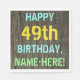 Este divertido diseño de servilletas de cumpleaños incluye un mensaje como "FELIZ CUMPLEAÑOS 49, NOMBRE - AQUÍ!", donde el nombre puede ser personalizado. El fondo está decorado con un estilo rústico, marrón y falso de aspecto de grano de madera. El texto del mensaje personalizado presenta colores como azul, amarillo y verde, y tiene un aspecto inspirado en el de las letras pintadas y estampadas. Las servilletas como estas podrían ser usadas en una fiesta de cumpleaños para alguien que está celebrando su cumpleaños cuarenta y nueve. [~Z0000292]