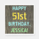 Este divertido diseño de servilletas de cumpleaños incluye un mensaje como "¡FELIZ 51º CUMPLEAÑOS, JESSICA!", donde el nombre puede ser personalizado. El fondo está decorado con un estilo rústico, marrón y falso de aspecto de grano de madera. El texto del mensaje de personalizable presenta colores como azul, amarillo y verde, y tiene un aspecto inspirado en el de las letras pintadas y estampadas. Las servilletas como estas podrían ser usadas en una fiesta de cumpleaños para alguien que está celebrando su primer cumpleaños. [~Z0000292]