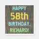 Este divertido diseño de servilletas de cumpleaños incluye un mensaje como "¡FELIZ 58º CUMPLEAÑOS, RICHARD!", donde el nombre puede ser personalizado. El fondo está decorado con un estilo rústico, marrón y falso de aspecto de grano de madera. El texto del mensaje de personalizable presenta colores como azul, amarillo y verde, y tiene un aspecto inspirado en el de las letras pintadas y estampadas. Las servilletas como estas podrían ser usadas en una fiesta de cumpleaños para alguien que esté celebrando su cincuenta y ocho cumpleaños. [~Z0000292]