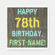 Este divertido diseño de servilletas de cumpleaños incluye un mensaje como "¡FELIZ CUMPLEAÑOS 78, NOMBRE PRIMERO!", donde el nombre puede ser personalizado. El fondo está decorado con un estilo rústico, marrón y falso de aspecto de grano de madera. El texto del mensaje personalizado presenta colores como azul, amarillo y verde, y tiene un aspecto inspirado en el de las letras pintadas y estampadas. Las servilletas como estas podrían ser usadas en una fiesta de cumpleaños para alguien que está celebrando su cumpleaños setenta y ocho. [~Z0000292]