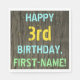 Este divertido diseño de servilletas para fiestas de cumpleaños incluye un mensaje como "¡FELIZ 3er CUMPLEAÑOS, NOMBRE PRIMERO!", donde el nombre puede ser personalizado. El fondo está decorado con un estilo rústico, marrón y falso de aspecto de grano de madera. El texto del mensaje personalizado presenta colores como azul, amarillo y verde, y tiene un aspecto inspirado en el de las letras pintadas y estampadas. Las servilletas como estas podrían ser usadas en una fiesta de cumpleaños para alguien que esté celebrando su tercer cumpleaños. [~Z0000292]