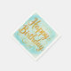 Estas servilletas fiestas presentan una impresionante acuarela feliz cumpleaños impresa en azul acuático y oro.