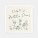 Como ves esta única y elegante servilleta de cumpleaños tiene una plantilla bien diseñada. Con vajilla de brunch de color verde, ramo floral, velas, tarta, botella de vino y vidrio, uvas, cuchillo y tenedor y nombre escrito a mano. Todo sobre fondo crema. Lo que puede personalizar fácilmente al pulsar el botón de personalización.