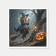 Una bruja montada en una escoba mientras mandaba mensajes de texto a su teléfono móvil choca con un árbol cerca de un reluciente jack-o-lantern.