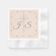 El diseño presenta las iniciales de novia y novio elegantemente posicionados a ambos lados de una cruz de plata con anillos bodas. El texto y las imágenes se muestran en un borde encantador y delicado. El fondo es rosa champán. También disponible en blanco. Muy formal y elegante. Diseñado para coordinar con la "Suite Boda simplemente católica".
