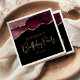 Estas servilletas glamorosas de papel para la fiesta de cumpleaños de moda presentan una imagen acuarela de una ágata geodésica en tonos burdeos rojos con falsos purpurinas de oro resaltados. Las palabras "fiesta de cumpleaños" aparecen en un falso purpurina de oro en un estilo de letra decorativo y moderno. Personalizar con el nombre del honorario y la fecha en texto de color oro.