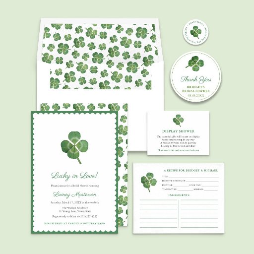 Un tema muy popular con elementos de acuarela clásicos y estilo. Añada un elegante toque de acabado a su fiesta Bridal Shower, de temática irlandesa, con estos elegantes platos de papel verde y blanco "Lucky In Love", con un shamrock acuático pintado a mano (trébol de cuatro hojas).